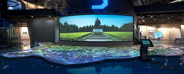 在一個(gè)相對(duì)封閉的空間內(nèi)(多功能播放室),屏幕上的超長(zhǎng)跨度的廣闊畫(huà)面充滿(mǎn)觀(guān)賞者的視野,